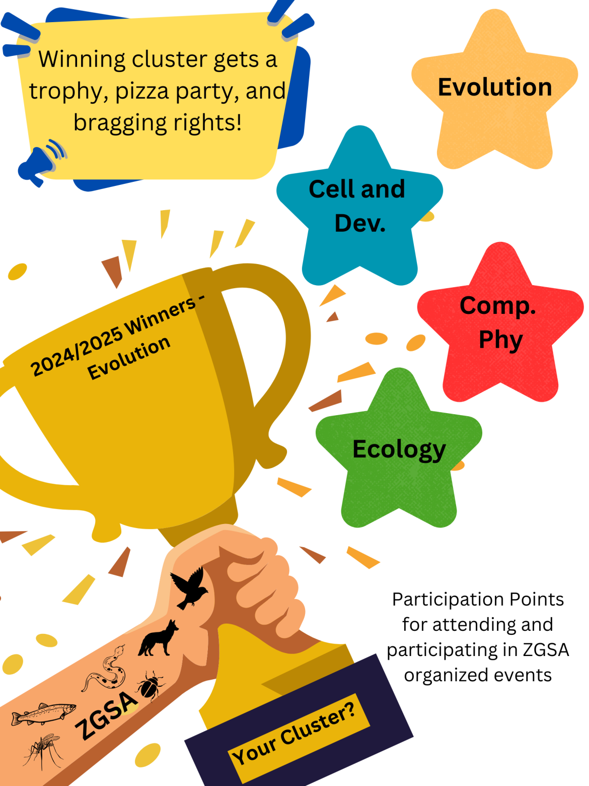 The Zoology Graduate Student Association (ZGSA) is dedicated to organizing events and providing resources for Zoology graduate students at UBC. You can contact them at zoology.zgsa@ubc.ca.